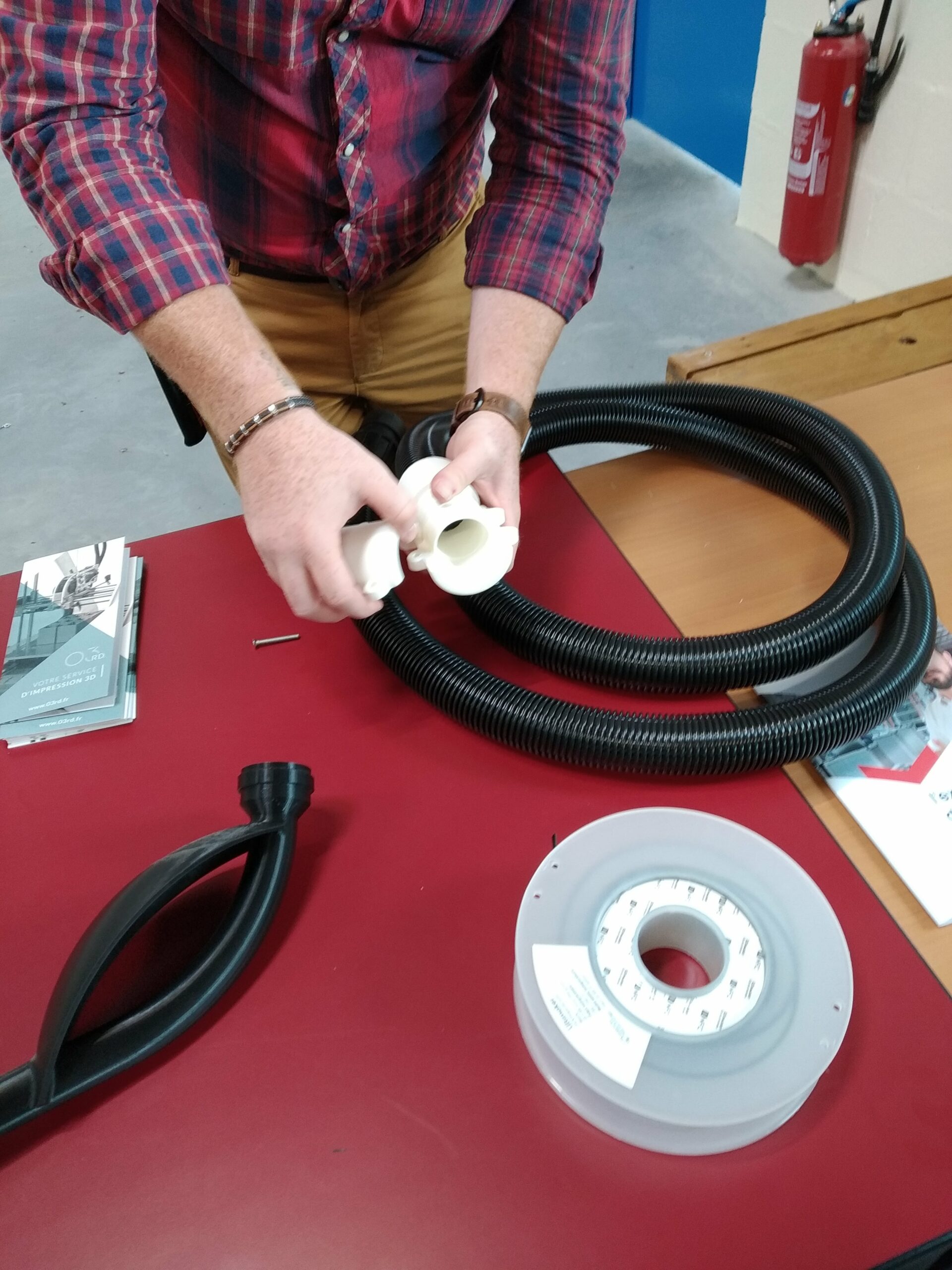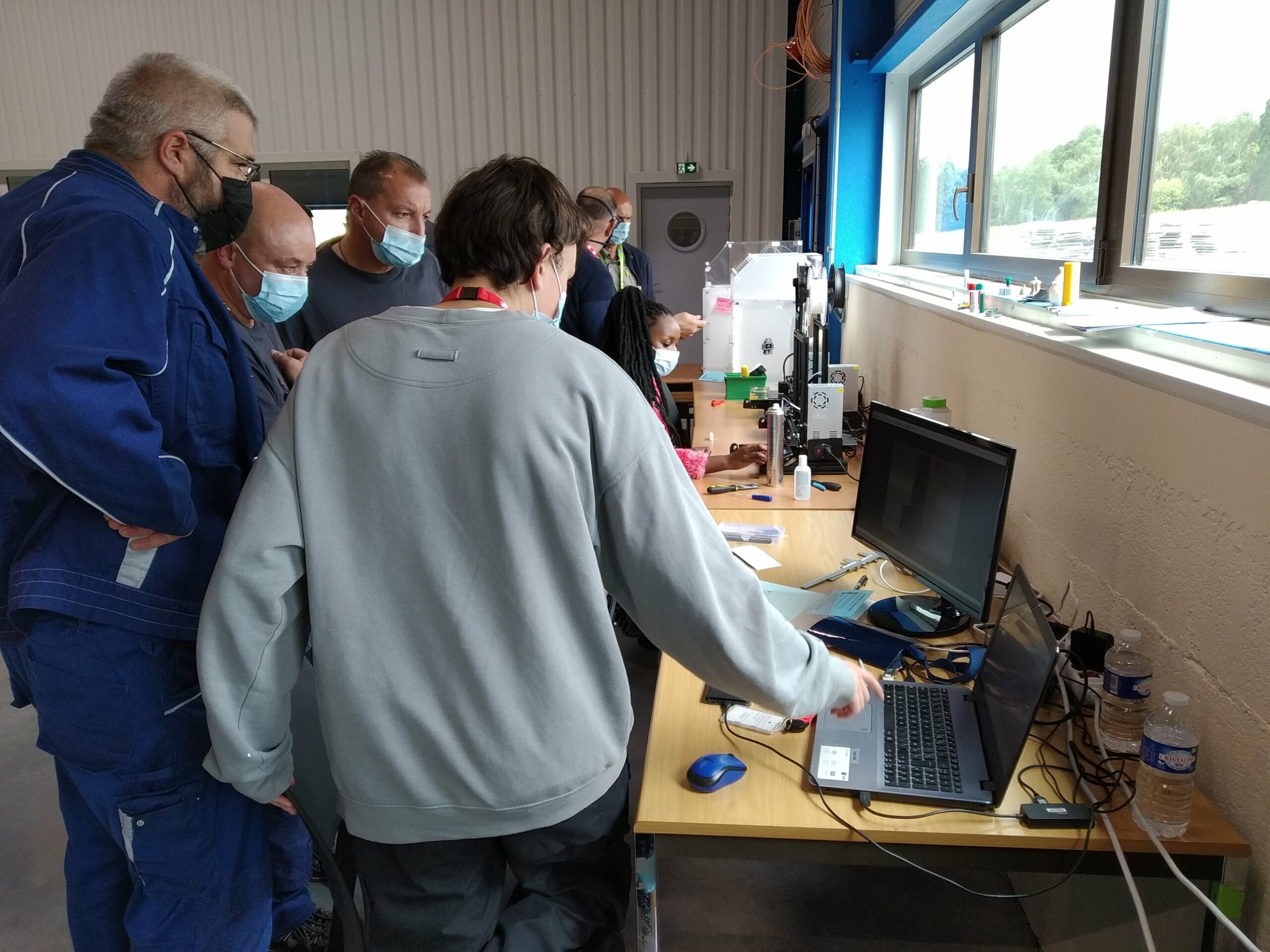Le point de départ : le besoin de FAMAT de gagner en efficacité sur ses interventions de maintenance et de diffuser une culture de l’amélioration continue. Avec l’appui du Blue Lab, quinze collaborateurs ont été formés à l’impression 3D et aux outils numériques, en s’appuyant sur un parcours conçu avec l’IUT. Très vite, un premier prototype – un adaptateur d’aspiration des limailles d’usinage – a été conçu et testé en trois jours seulement. Dans la foulée, un groupe d’étudiants a développé un MiniLab mobile, testé directement dans l’usine, avant qu’une journée de démonstration ne permette d’acculturer l’ensemble des salariés, en lien avec le service RH de l’entreprise.